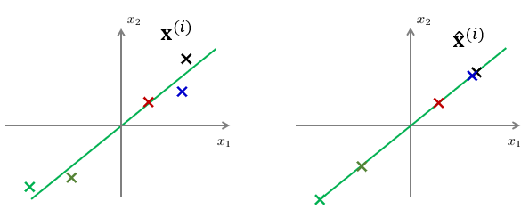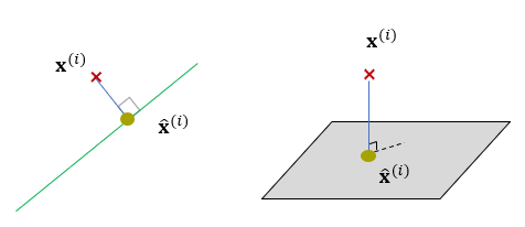 좌표상에서 데이터의 위치가 곧 데이터의 정보를 나타내므로 정보를 원래 모습 그대로 최대한 유지하려면(또는 정보 손실을 최소화하려면) 원래 데이터 \(\mathbf{x}^{(i)}\)와 근사화된 데이터 \(\hat{\mathbf{x}}^{(i)}\) 간의 거리 오차 \(\lVert \mathbf{x}^{(i)}-\hat{\mathbf{x}}^{(i)} \rVert_2\)를 최소화하면 될 것이다.