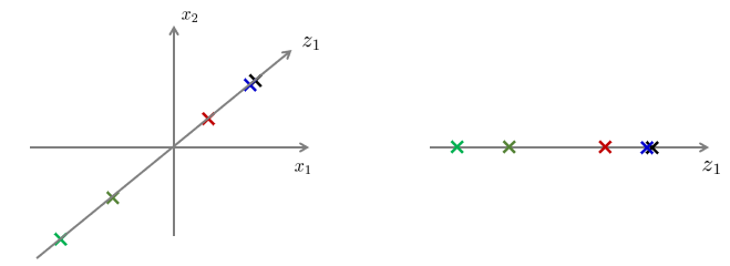 데이터를 연결해 보니 데이터가 모두 직선상에 있다는 것을 알게 됐다고 하자. 이 직선으로 표현된 축(성분)을 \(z_1\)으로 한다면 애초에 \(x_1\)과 \(x_2\)의 두 축(성분)으로 이루어진 2차원 공간상의 데이터를 \(z_1\)축으로 이루어진 1차원 공간상에 표현할 수 있었을 것이다.