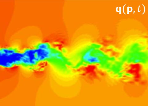 \(\mathbf{q}(\mathbf{p},t)\)를 위치벡터 \(\mathbf{p}\)와 시간 \(t\)를 독립변수로 하는 벡터 필드 (예를 들면 유동장에서의 속도 벡터)라고 하자. 이 벡터의 시간 평균을 \(\bar{\mathbf{q}}(\mathbf{p})\)라고 하면 벡터 필드가 평균을 기준으로 변동하는 성분(unsteady component)은 다음과 같이 기저함수(basis function)의 선형 조합으로 나타낼 수 있다.
