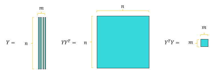 \[ \begin{align} & Y= U \Sigma V^T \\ \\ & U= \begin{bmatrix} \mathbf{u}_1 & \cdots & \mathbf{u}_n \end{bmatrix} \in \mathbb{R}^{n \times n}, \ V= \begin{bmatrix} \mathbf{v}_1 & \cdots & \mathbf{v}_m \end{bmatrix} \in \mathbb{R}^{m \times m} \end{align} \]